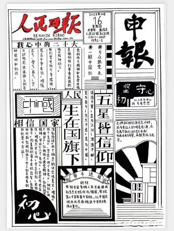 这两张手抄报以报纸的形式向大家展开,告诉了我们党的二十大召开时间及会议主要内容,带领我们回顾了中国共产党百年来的沧桑历程,并结合众多中国元素,向大家介绍了党的二十大精神,勉励我们坚守初心,团结一心奋进新征程。