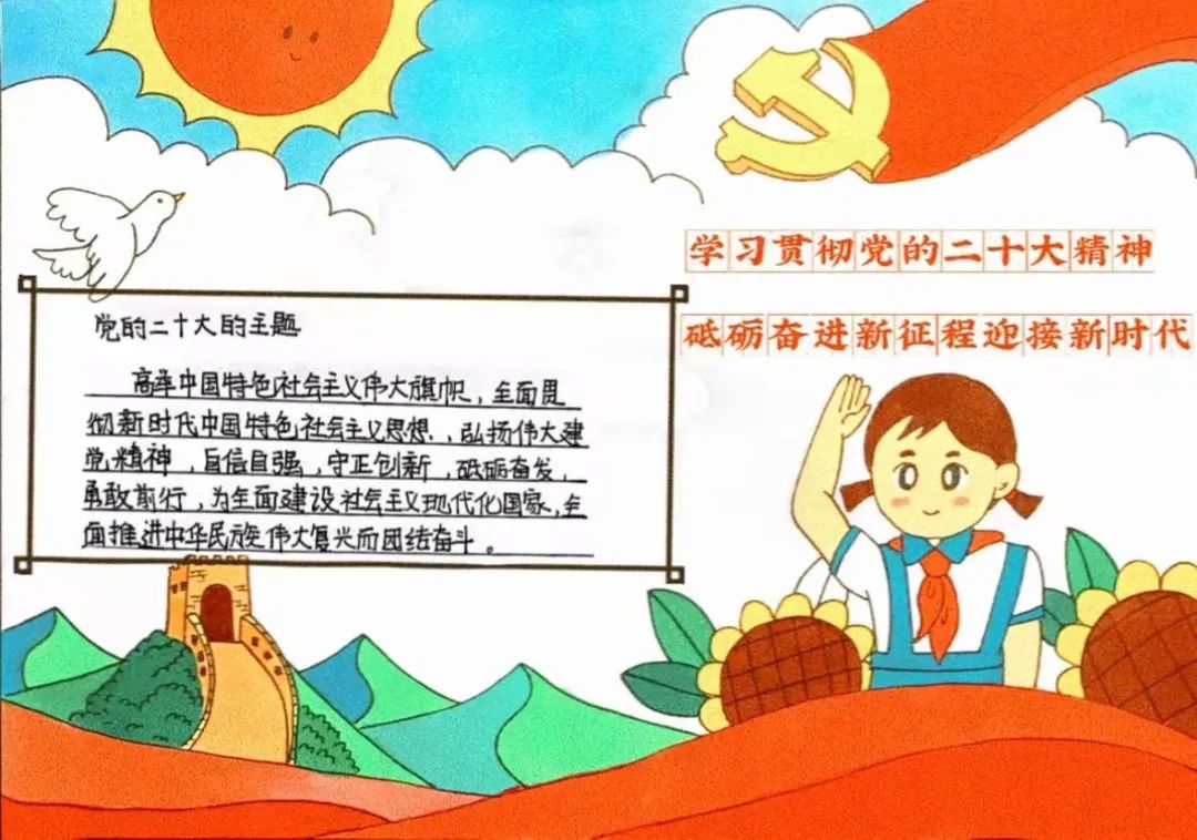 这张手抄报加入了更多的卡通元素,以高挂的太阳、飞翔的和平鸽、蜿蜒的长城为背景,右上角画着党徽,右下角是一位正敬着队礼的少先队队员,内容丰富,富有创意,表明了所有党员将不忘初心跟党走,学习贯彻党的二十大精神,砥砺奋进新征程,迎接新时代;在手抄报的正中间写着党的二十大的主题内容,作品紧扣主题,讴歌党的光辉历程和伟大成就,彰显了全体党员奋发有为的昂扬斗志。