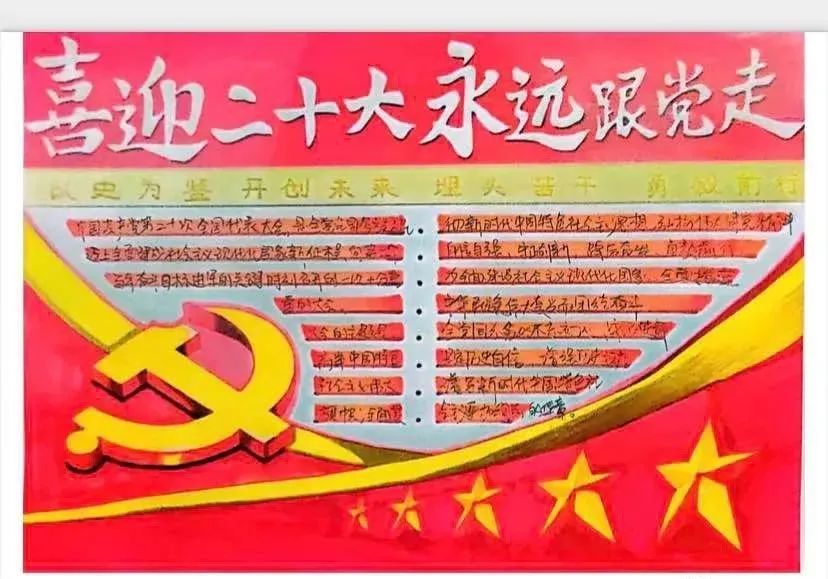 手抄报整体主要采用红黄两种配色, “喜迎二十大 永远跟党走”采用白色艺术大字,主题鲜明;左下角是金黄色的立体党徽,右下角画着五颗五角星,是国旗的象征,版面色彩鲜艳,图文并茂;集党史知识、字体设计、插图绘画于一体,用绚丽的色彩和激昂的文字描绘出党的光辉历程和伟大成就,展示了对党的满腔热情,表达了对党和祖国的无限热爱。