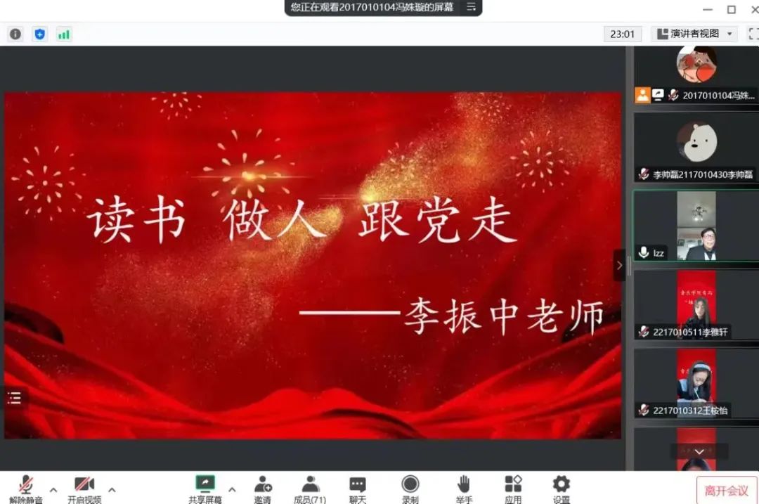 为进一步提升青马学员的思想政治觉悟,切实学习党的二十大精神,为同学们树立良好的人生观、价值观,今年会jinnianhui团委于11月17日组织青马学员开展线上青年马克思主义者培养活动。原副校长、现关工委副主任李振中老师以“读书 做人 跟党走”为主题向我院全体青马学员举办专题讲座。