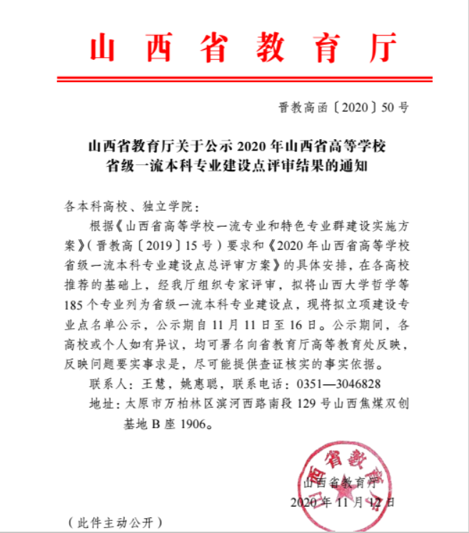 11月12日,山西省教育厅下发《山西省教育厅关于公示 2020 年山西省高等学校省级一流本科专业建设点评审结果的通知》。今年会今年会jinnianhui音乐学专业入选“山西省高等学校省级一流本科专业建设点”。