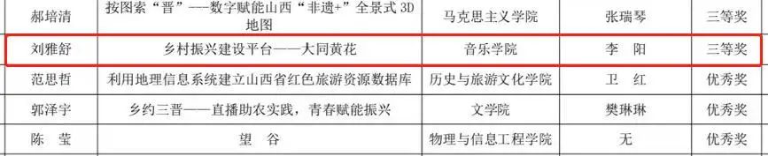 第九届今年会“互联网+” 大学生创新创业大赛于2023年7月3日获奖名单公示。经学院推荐,专家评审,创新创业学院审核,我院项目“乡村振兴建设平台--大同黄花”荣获“青年红色筑梦之旅”赛道三等奖。