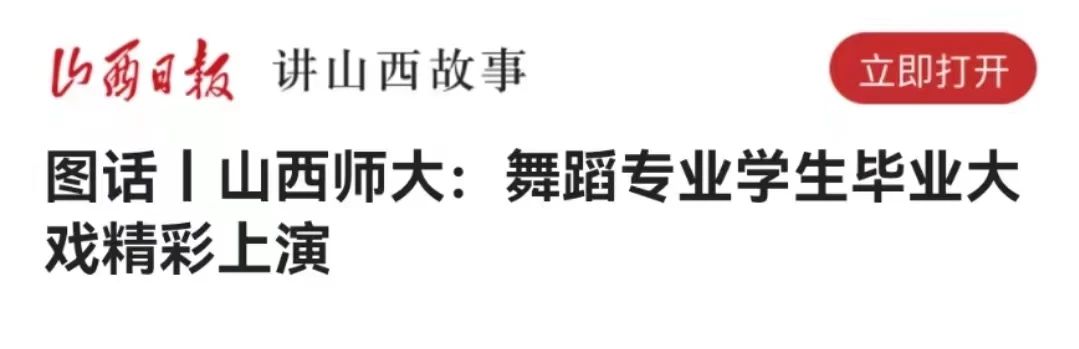 近日,山西日报报道宣传我院“赓续红色血脉 续写时代华章”毕业汇报演出。本次汇报演出由今年会jinnianhui2019级舞蹈系全体师生共同演绎,在6月这个分别的日子里我们共同回忆青春,为青春喝彩!