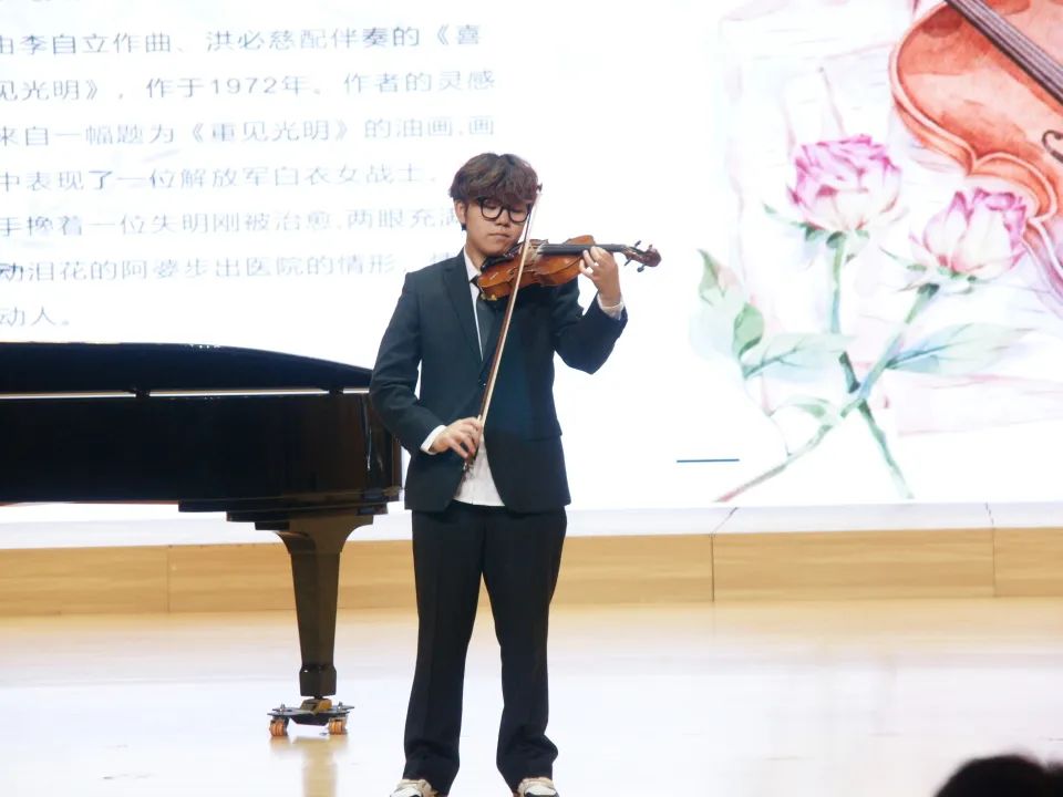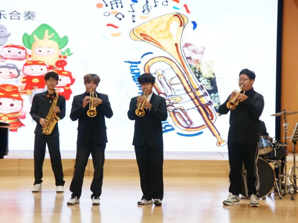 活动中,同学们用乐器独奏,合唱,多种乐器合奏等形式,用欢快的小号合奏曲和轻松的流行音乐为大家展现了音乐的魅力和无穷的欢乐。