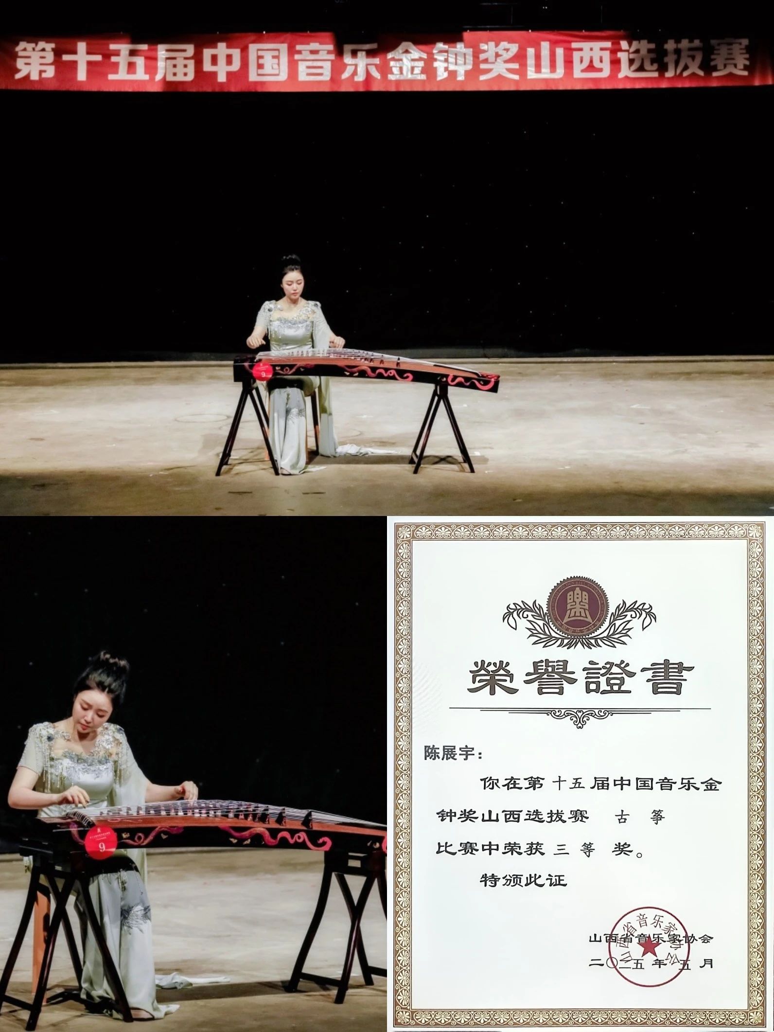 本次大赛全省共计400余人报名参赛,我院在此次比赛中共有三名教师获奖,一名学生获奖。其中,陈展宇老师获古筝组三等奖,陈源原老师获管乐组优秀奖,郭昊玥同学获管乐组三等奖,解晓瑞老师获优秀指导教师奖。我院师生凭借深厚的艺术功底与出色的舞台表现,在激烈竞争中脱颖而出,载誉而归。