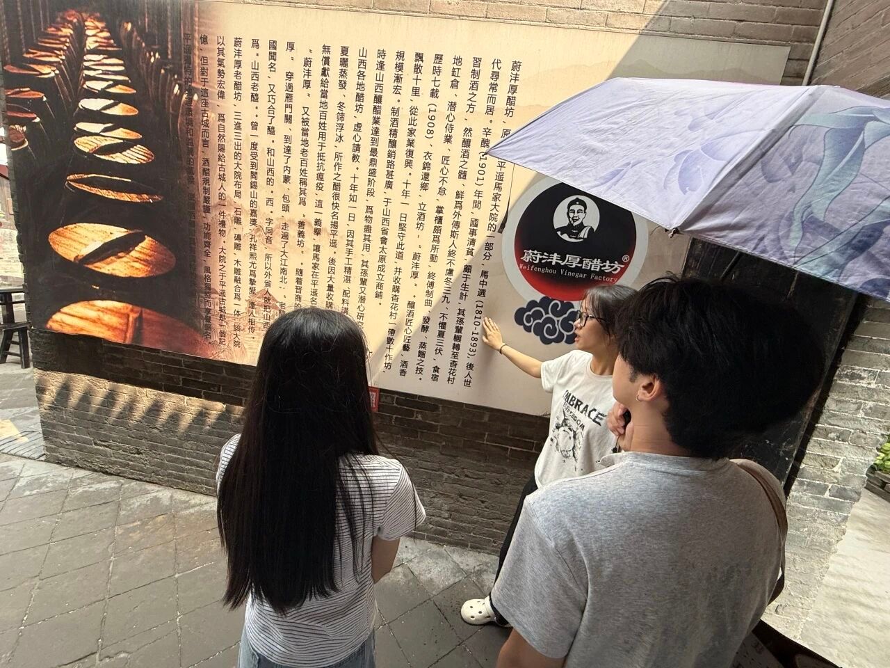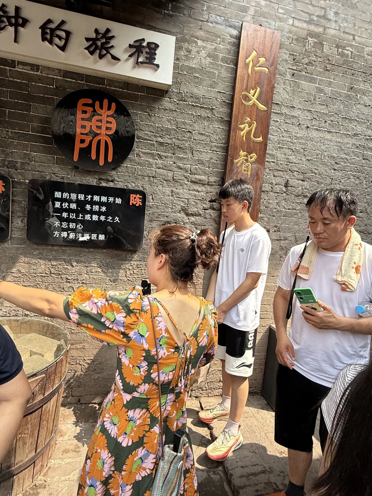 我们好奇地凑到发酵缸前,看冒着气泡的醋醅,听师傅讲“夏伏晒、冬捞冰”的陈酿诀窍,到了品尝环节,大家端着小杯,依次尝了陈醋、香醋、米醋 。陈醋醇厚绵长,香醋酸甜清爽,米醋柔和微酸,不同风味在舌尖散开,让我们深深领略到山西醋文化的博大精深。