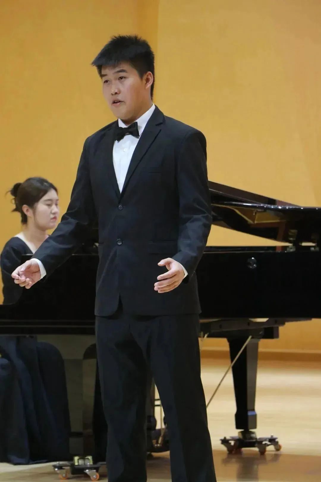 更快地进步。音乐会共由12位同学演唱了我国经典的、具有代表性的艺术歌曲,与观众一起“共绘五线谱,唱响时代最强音”。