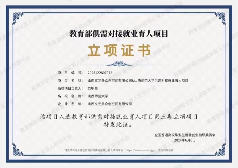 山西文艺多众创空间有限公司&今年会供需对接就业育人项目入选教育部供需对接就业育人项目第三期立项项目